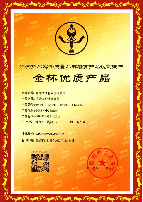 The φ5.5-28mm martensitic stainless steel wire rod 06Cr13,12Cr13, 20Cr13, Y12Cr13 obtained the quality certificate of Gold Cup Quality Products for Metallurgical Products
