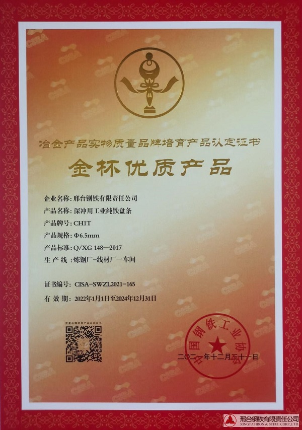 The φ6.5mm pure iron wire coil CH1T for deep drawing obtained the quality certificate of Gold Cup Quality Products for Metallurgical Products