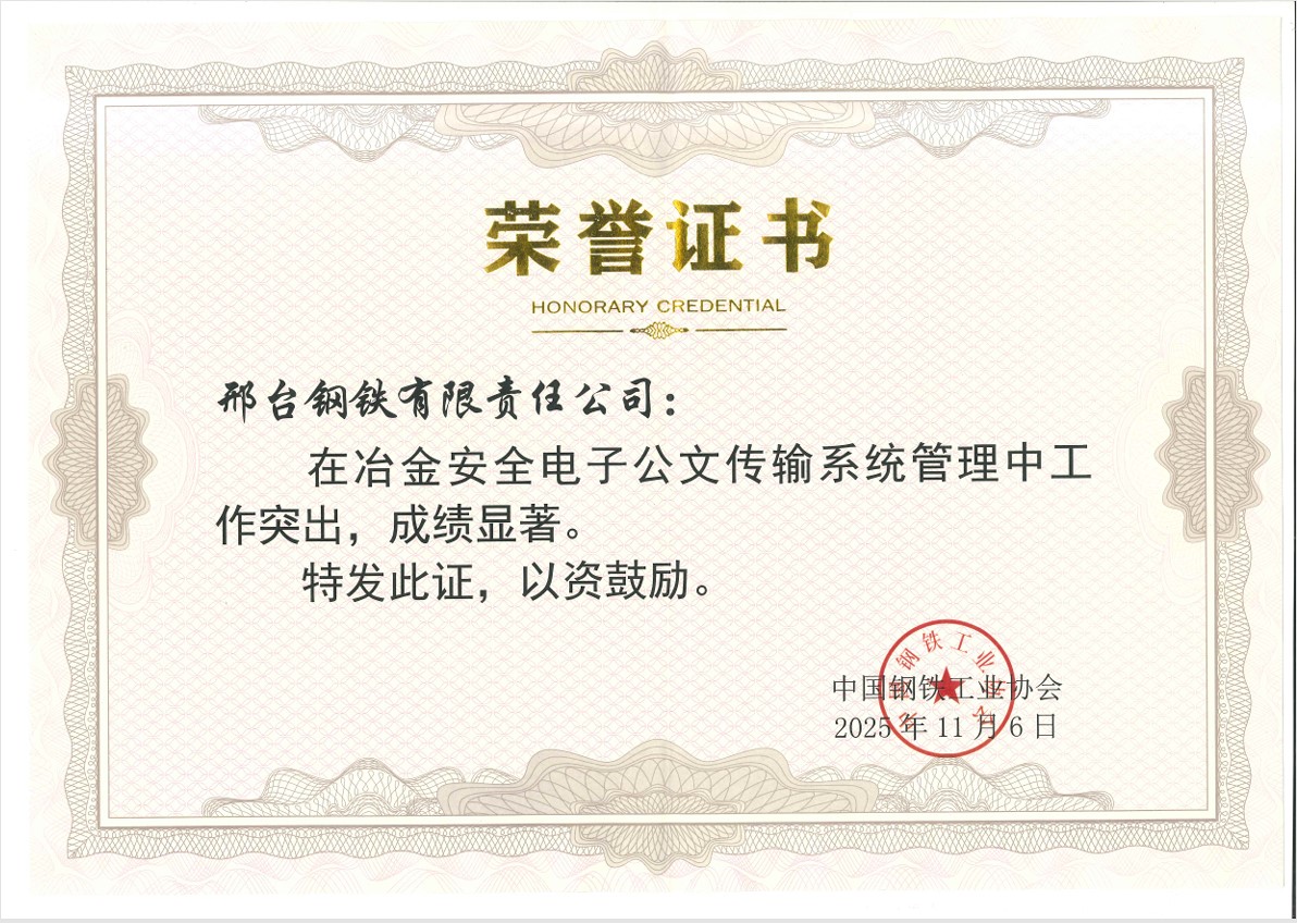 In November 2025, due to its outstanding performance in the management of the Metallurgical Safety Electronic Document Transmission System, Xingtai Steel was awarded the title of "Advanced Unit" by the China Iron and Steel Association (CISA).
