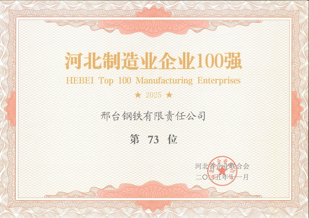 In2025, Xingtai Iron and Steel Co., Ltd. was honored to rank 73rd on the list of "Top 100 Manufacturing Enterprises in Hebei Province".