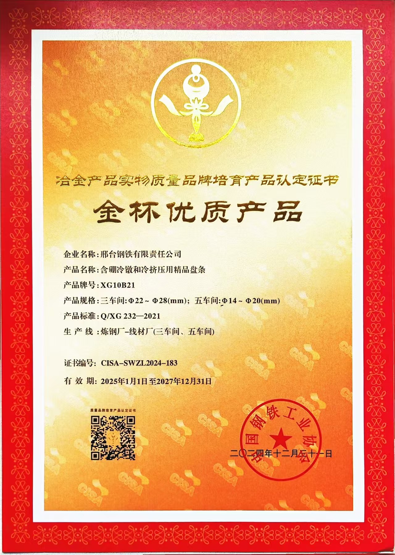 In 2024, the company's high-quality plate strips XG10B21 products containing boron cold uperting and cold extrusion won the certification certificate of physical quality brand cultivation products (gold cup high-quality products) of metallurgical products, referred to as the Golden Cup Award. The selection activity of "Physical Quality Brand Cultivation of Metallurgical Products" was launched in March 24 and sponsored by the China Iron and Steel Industry Association. The Gold Cup Award is the only relatively authoritative award in the metallurgical industry organized by the China Iron and Steel Industry Association.