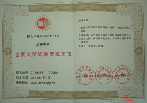Xingtai Steel was awarded Model units civilized services in China of 2010
