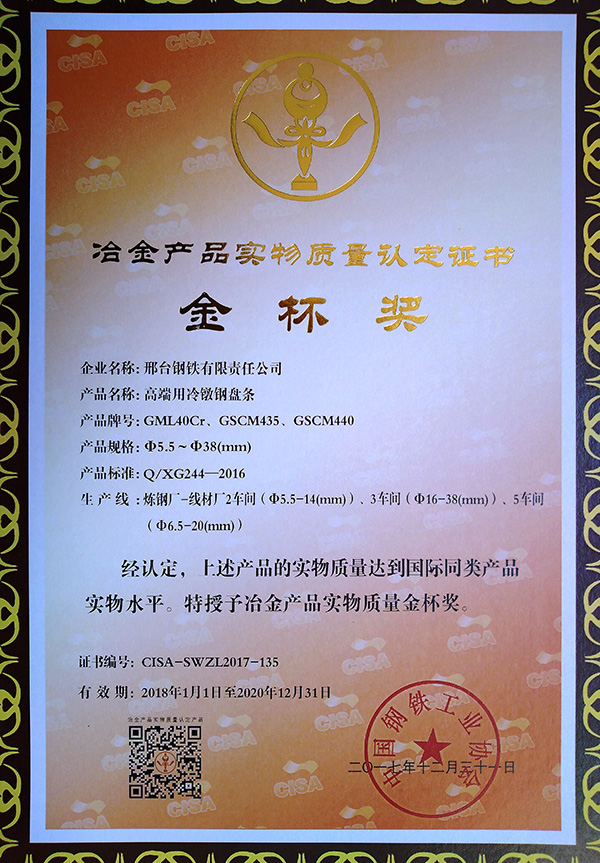 高端用冷鐓鋼盤(pán)條GML40Cr、GSCM435、GSCM440Φ5.5~Φ38(mm)獲冶金產(chǎn)品實(shí)物質(zhì)量金杯獎(jiǎng)
