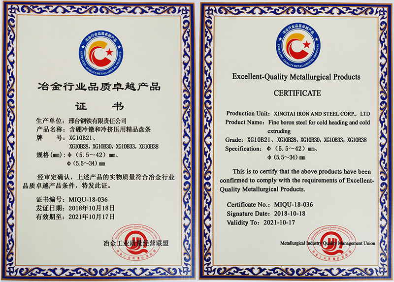 含硼冷鐓和冷擠壓用精品盤(pán)條XG10B21φ5.5-42mm規(guī)格和XG10B28/XG10B30/XG10B33 /XG10B38φ5.5- 34mm規(guī)格,獲冶金行業(yè)品質(zhì)卓越產(chǎn)品。
