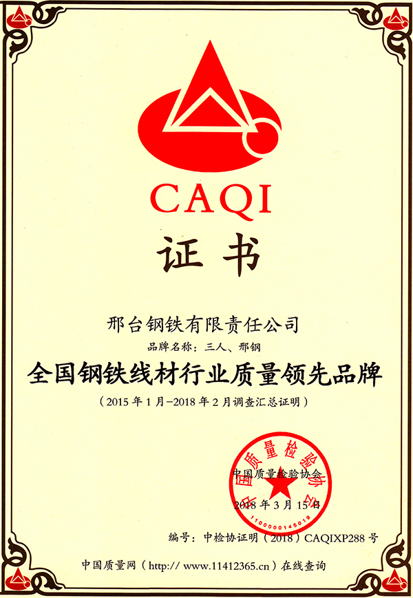 “三人、邢鋼”品牌榮獲全國(guó)鋼鐵線材行業(yè)質(zhì)量領(lǐng)先品牌