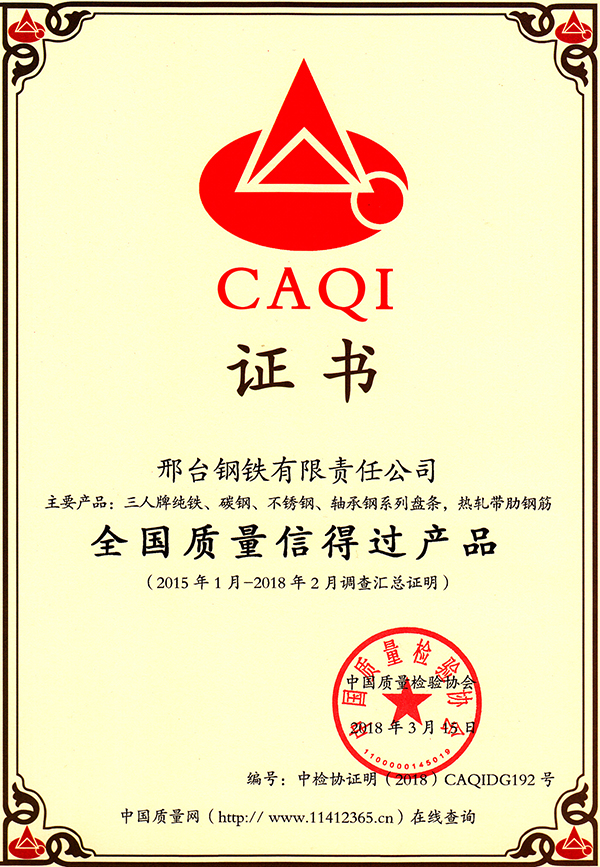 三人牌純鐵、碳鋼、不銹鋼、軸承鋼系列盤(pán)條,熱軋帶肋鋼筋獲全國(guó)質(zhì)量信得過(guò)產(chǎn)品