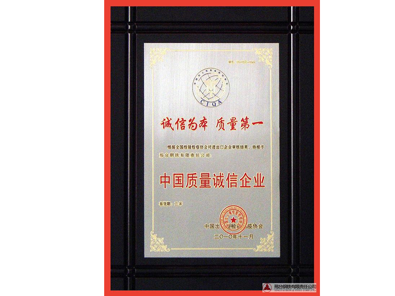 2010年11月,中國出入境檢驗檢疫協(xié)會授予邢鋼“中國質量誠信企業(yè)”。