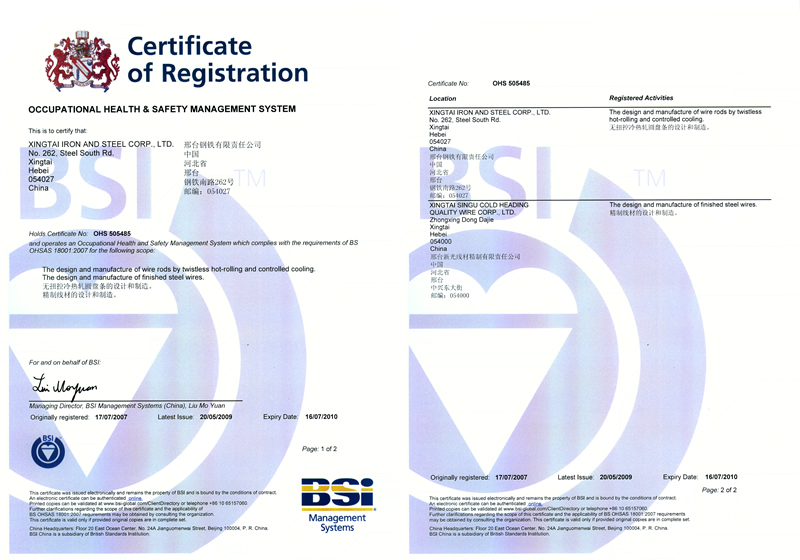 2007年7月17日,邢鋼獲OHSAS 18001:2007認(rèn)證證書(職業(yè)健康安全管理體系規(guī)范)。