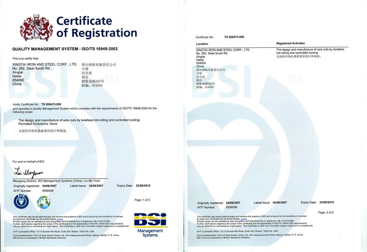 2007年8月24日,邢鋼獲ISO/TS 16949:2002認(rèn)證證書(國際汽車行業(yè)質(zhì)量管理體系認(rèn)證)。