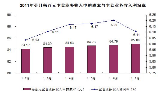 規(guī)模以上工業(yè)企業(yè)實現(xiàn)主營業(yè)務收入458544億元,同比增長29.8%。每百元主營業(yè)務收入中的成本為85.00元,主營業(yè)務收入利潤率為6.11%。