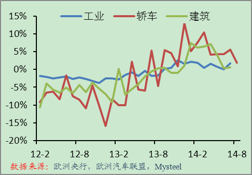 歐元區(qū)9月制造業(yè)PMI初值為50.5%,連續(xù)5個月環(huán)比下降,表明歐元區(qū)經濟增長依舊低迷,加之當前歐元區(qū)低通脹未見起色,預計經濟低增長可能在一段時間內為歐元區(qū)經濟的常態(tài)。目前歐洲央行采取逐步放寬政策的措施來改善歐元區(qū)信貸,但從當前來看,并沒有多大改善,預計歐洲央行將進一步放寬政策以挽救歐元區(qū)經濟。但即便如此,在財政改革遲緩的情況下,貨幣政策對于經濟的刺激效果不大。從歐洲下游行業(yè)的表現看,增長速度也是連續(xù)下滑。