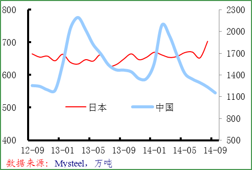 9月份中國流通環(huán)節(jié)鋼材庫存繼續(xù)下降,9月底全國主要鋼的社會庫存為1154萬噸,比8月底下降80萬噸,較去年同期下降314萬噸,鋼廠價格大幅下滑,貿易商加大了去庫存力度。中鋼協統計數據顯示,9月中旬末重點鋼企鋼材庫存為1590萬噸,較8月中旬末增長65萬噸,全國重點鋼廠鋼廠庫存連續(xù)兩個月增長。日本國內庫存大幅上升,8月末全國鋼材庫存為703萬噸,創(chuàng)10年來最高水平,鋼廠庫存增長明顯,市場需求難以消化供應。