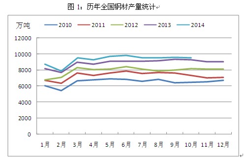 其一,鋼材產(chǎn)量增速有所回落。根據(jù)統(tǒng)計(jì),2014年1-10月,我國(guó)粗鋼產(chǎn)量68535萬(wàn)噸,同比增長(zhǎng)2.1%,增速同比減緩7.1個(gè)百分點(diǎn);鋼材產(chǎn)量93447萬(wàn)噸,增長(zhǎng)4.7%,減緩6.9個(gè)百分點(diǎn),國(guó)家政策的導(dǎo)向在這其中起了主要作用。一方面,2014年我國(guó)從政策上嚴(yán)格限制了鋼鐵等產(chǎn)能過剩行業(yè)的投資,由此導(dǎo)致除新疆地區(qū)外,其余省份全年均無(wú)高爐新建計(jì)劃,鋼鐵新增產(chǎn)能被控制;另一方面,京津冀地區(qū)持續(xù)霧霾天氣引發(fā)了公眾普遍擔(dān)憂,作為全國(guó)鋼鐵生產(chǎn)基地的河北省不時(shí)由于環(huán)境污染而被強(qiáng)制采取限產(chǎn)措施,雖然對(duì)于環(huán)保排污設(shè)施較為齊全的大型鋼廠影響有限,但中小型鋼廠的生產(chǎn)卻受到了較為明顯的影響,全國(guó)鋼材整體產(chǎn)量增速下滑也就變得順理成章