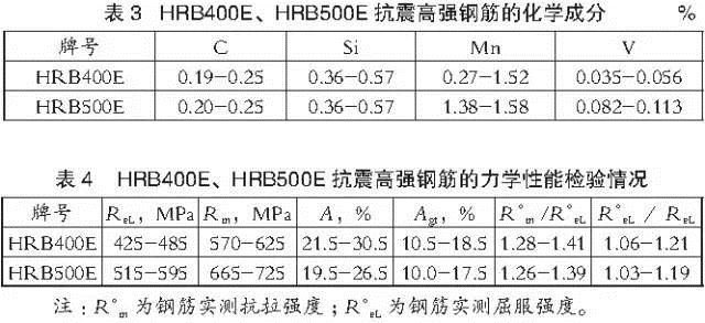 我國在GB 1499.2-2007標(biāo)準(zhǔn)中首次將鋼筋的抗震性能指標(biāo)納入國標(biāo)中,并規(guī)定了抗震鋼筋的三個代表性指標(biāo):強(qiáng)屈比(R?m /R?eL)、超屈比(R?eL/ReL)和最大力總伸長率(Agt)。國內(nèi)某鋼廠HRB400E、HRB500E抗震鋼筋多樣品檢驗(yàn)獲得的化學(xué)成分和力學(xué)性能指標(biāo)見表3和表4。