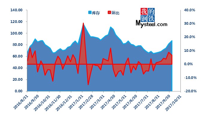 據(jù)mysteel統(tǒng)計的樣本優(yōu)特鋼廠庫存顯示,現(xiàn)全國優(yōu)特鋼廠棒材總庫存86.92萬噸,較國慶節(jié)前增加5.67萬噸,環(huán)比增加6.5%,較2016年國慶節(jié)后第一周庫存低0.31萬噸,較2016年均值高9.61萬噸,上漲12.43%。2017年內均值為84.43萬噸,當前庫存較均值增加2.49萬噸。樣本鋼廠總庫存連續(xù)7周上漲。
