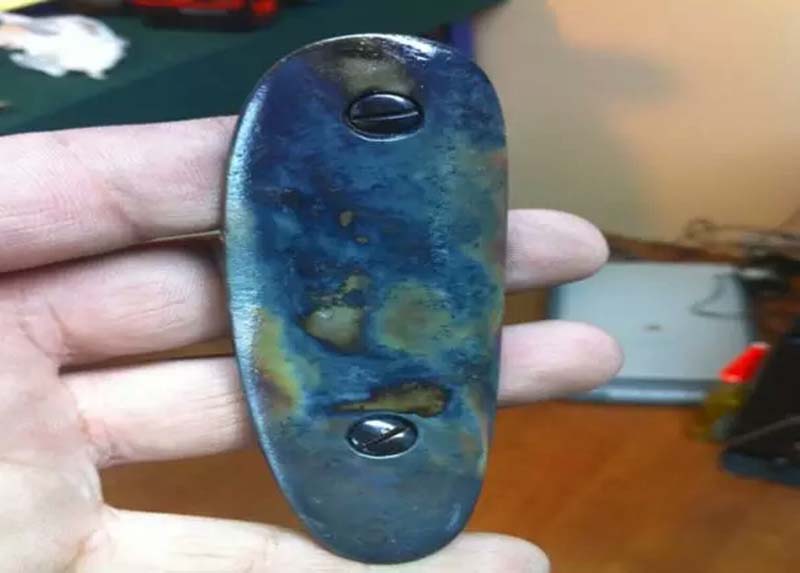 發(fā)藍(或烤藍)借助化學方式來完成:有熱、冷、熏、銹等方式,早期的槍支發(fā)藍處理采用銹發(fā)藍,這個過程是用酸溶液涂覆槍管部件,讓零件均勻生銹,然后將銹蝕處理(擦洗)掉,留下深藍色的表面。此工藝經常需要幾天時間完成,而且是非常勞動密集型的,現(xiàn)已被主要槍械制造商放棄。