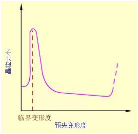 (2)預(yù)先變形度 變形度的影響主要與金屬變形的均勻度有關(guān)。變形越不均勻, 再結(jié)晶退火后的晶粒越大。變形度很小時(shí),因不足以引起再結(jié)晶,晶粒不變。當(dāng)變形度達(dá)到2~10%時(shí),金屬中少數(shù)晶粒變形,變形分布很不均勻,所以再結(jié)晶時(shí)生成的晶核少,晶粒大小相差極大,非常有利于晶粒發(fā)生吞并過程而很快長(zhǎng)大,結(jié)果得到極粗大的晶粒。使晶粒發(fā)生異常長(zhǎng)大的變形度稱作臨界變形度。生產(chǎn)上應(yīng)盡量避免在臨界變形度范圍內(nèi)的塑性變形加工。超過臨界變形度之后,隨變形度的增大,晶粒的變形更加強(qiáng)烈和均勻,再結(jié)晶核心越來越多,因此再結(jié)晶后的晶粒越來越細(xì)小。但是當(dāng)變形度過大(約≥90%)時(shí), 晶粒可能再次出現(xiàn)異常長(zhǎng)大,一般認(rèn)為它是由形變織構(gòu)造成的。