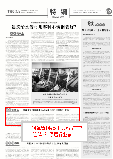 本報(bào)訊 近日,從邢鋼傳來消息,邢鋼彈簧鋼線材7月份銷量達(dá)4786噸,是今年初以來最好水平。從2015年起,邢鋼彈簧鋼線材在國內(nèi)市場占有率穩(wěn)居行業(yè)前三。2019年,受環(huán)保限產(chǎn)影響,邢鋼彈簧鋼線材在全國市場占有率為21.19%,居全國第二。