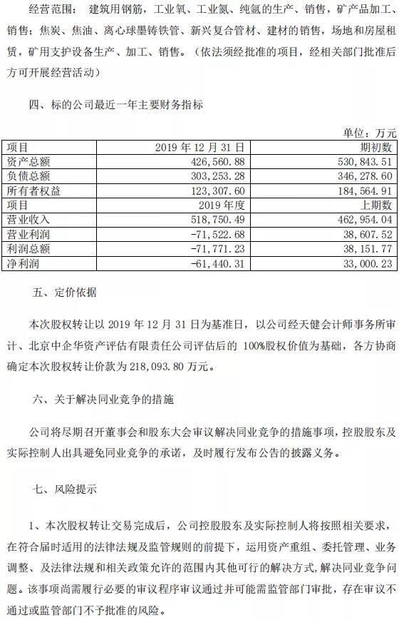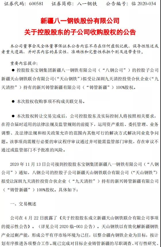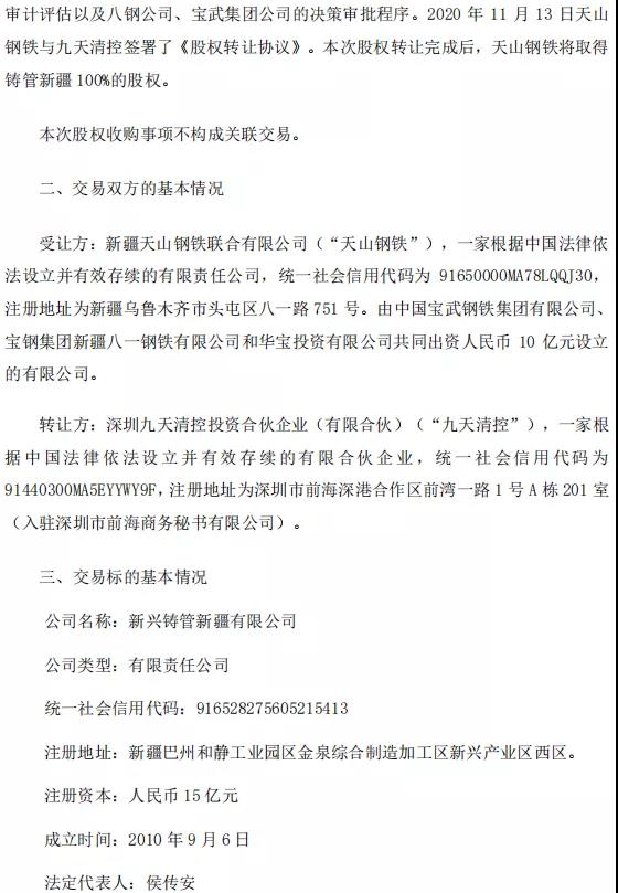 11月13日晚間,八一鋼鐵發(fā)布公告稱,該公司控股股東寶鋼集團(tuán)新疆八一鋼鐵有限公司的控股子公司新疆天山鋼鐵聯(lián)合有限公司擬受讓深圳九天清控投資合伙企業(yè)持有的新興鑄管新疆有限公司100%股權(quán)。11月13日,天山鋼鐵與九天清控簽署了《股權(quán)轉(zhuǎn)讓協(xié)議》。本次股權(quán)轉(zhuǎn)讓以2019年12月31日為基準(zhǔn)日,以公司經(jīng)天健會(huì)計(jì)師事務(wù)所審計(jì)、北京中企華資產(chǎn)評估有限責(zé)任公司評估后的100%股權(quán)價(jià)值為基礎(chǔ),各方協(xié)商確定本次股權(quán)轉(zhuǎn)讓價(jià)款為21.81億元。