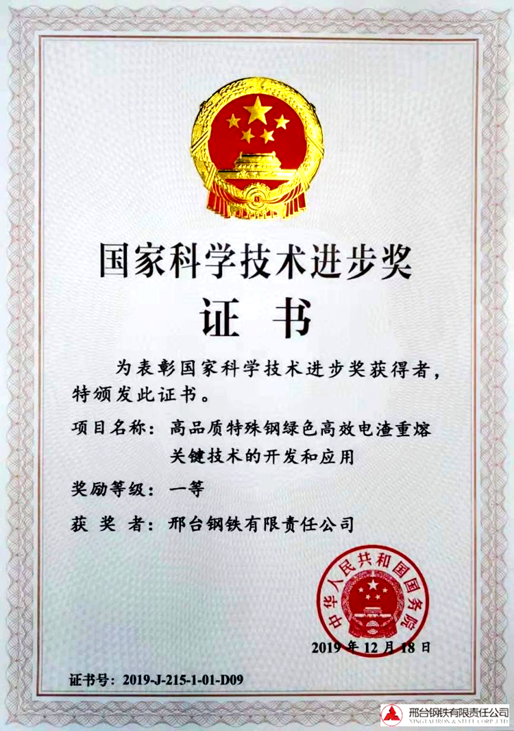 2019邢鋼“高品質(zhì)特殊鋼綠色高效電渣重熔關(guān)鍵技術(shù)的開發(fā)和應(yīng)用”還榮獲國(guó)家科學(xué)技術(shù)進(jìn)步獎(jiǎng)一等獎(jiǎng)。