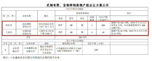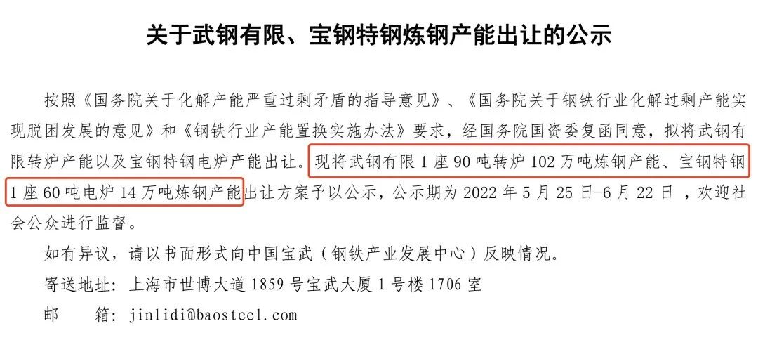 按照《國務(wù)院關(guān)于化解產(chǎn)能嚴重過剩矛盾的指導意見》、《國務(wù)院關(guān)于鋼鐵行業(yè)化解過剩產(chǎn)能實現(xiàn)脫困發(fā)展的意見》和《鋼鐵行業(yè)產(chǎn)能置換實施辦法》要求,經(jīng)國務(wù)院國資委復函同意,擬將武鋼有限轉(zhuǎn)爐產(chǎn)能以及寶鋼特鋼電爐產(chǎn)能出讓?,F(xiàn)將武鋼有限1座90噸轉(zhuǎn)爐102萬噸煉鋼產(chǎn)能、寶鋼特鋼1座60噸電爐14萬噸煉鋼產(chǎn)能出讓方案予以公示,公示期為2022年5月25日-6月22日,歡迎社會公眾進行監(jiān)督。