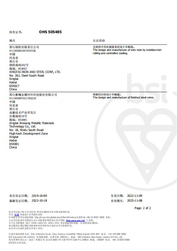 In order to carry out the concept of continuous improvement and continuously strengthen the safety and environmental protection, from 22nd to 26th in August, 8 experts from BSI (British Standards Institute) were invited to conduct a 5-day audit on the operation of Occupational Health and Safety Management System (ISO45001:2018) and Environmental Management System (ISO14001:2015). The audit team gave full affirmation and high evaluation to our progress on the work of occupational health and environmental protection, and also put forward guidance and suggestions for improvement. For the problems in operating system, the relevant departments will analyze the root causes, make a corrective action plan and learn by analogy to achieve the continuous improvement of the safety and environmental system, which is highly praised by the experts. As expected, Xingtai Steel successfully passed the certification of Safety and Environment System issued by BSI. Until now, Xingtai Steel has passed the certification of Safety and Environment System issued by BSI for 16 consecutive years.
