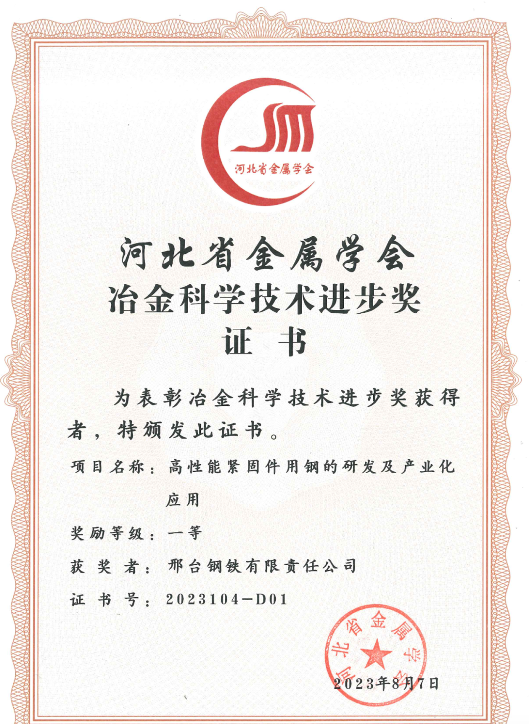 近日,邢臺鋼鐵有限責(zé)任公司兩項(xiàng)科技研發(fā)項(xiàng)目“高性能緊固件用鋼的研發(fā)及產(chǎn)業(yè)化應(yīng)用項(xiàng)目”“汽車底盤異形件用大規(guī)格高淬透性高潔凈度冷鐓鋼的研發(fā)及應(yīng)用”得到河北省金屬學(xué)會專家評審委員會的高度認(rèn)可,分別榮獲2023年度的 “河北冶金科學(xué)技術(shù)獎(jiǎng)”一、二等獎(jiǎng)。