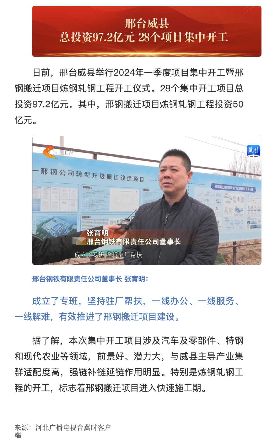 據(jù)悉,本次集中開工涉及汽車及零部件、特鋼、新材料和現(xiàn)代農(nóng)業(yè)等,前景好、潛力大,與威縣主導(dǎo)產(chǎn)業(yè)集群適配度高,特別是主會(huì)場煉鋼軋鋼工程的開工,標(biāo)志著邢鋼搬遷項(xiàng)目進(jìn)入快速施工期,必將為項(xiàng)目一期投產(chǎn)和全縣產(chǎn)業(yè)結(jié)構(gòu)優(yōu)化創(chuàng)造新優(yōu)勢、增添新動(dòng)能。