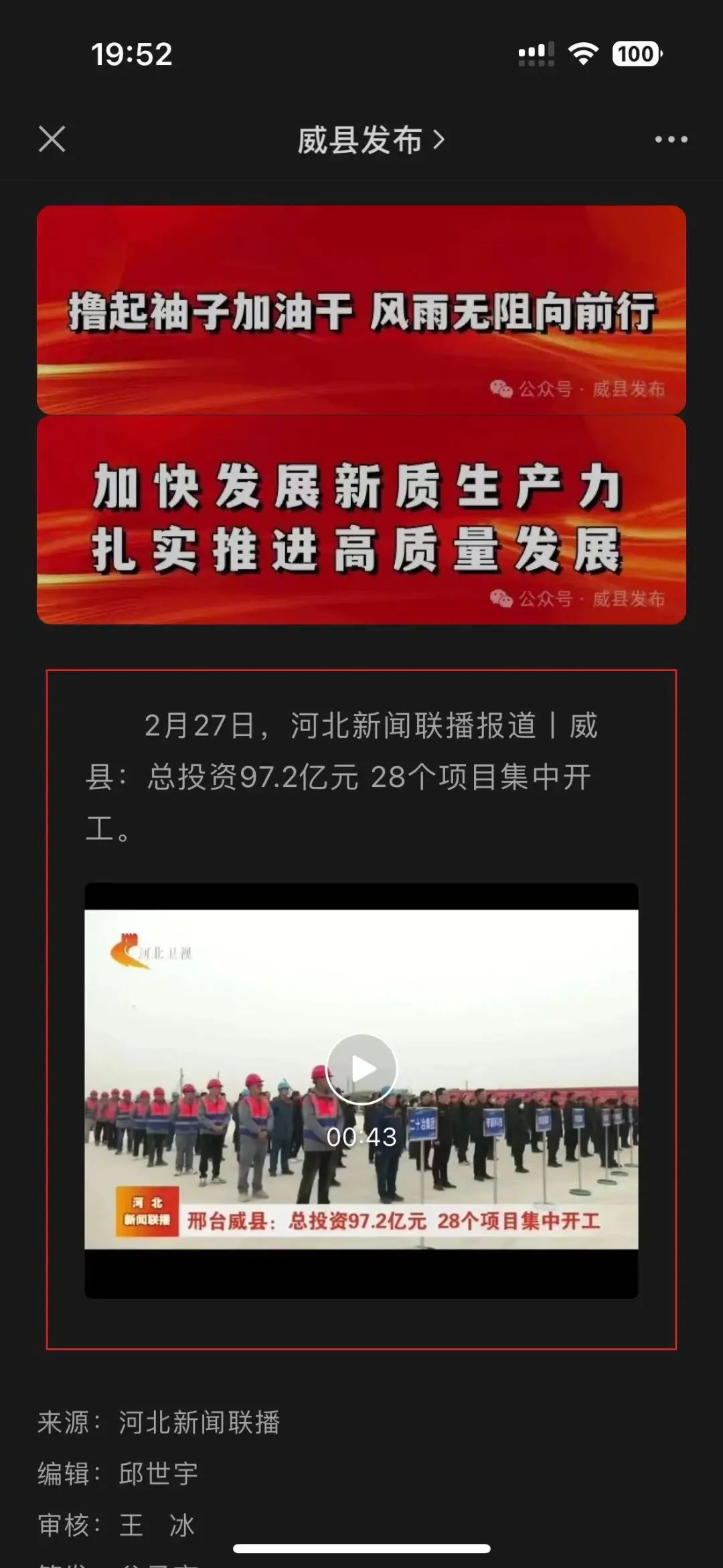 去年以來,威縣錨定抓招商、上項(xiàng)目、優(yōu)環(huán)境,成功引進(jìn)了一批大好高優(yōu)項(xiàng)目,有力推動(dòng)了縣域經(jīng)濟(jì)穩(wěn)健高質(zhì)量發(fā)展。去年簽約項(xiàng)目87個(gè)、總投資120億元,引進(jìn)央企子公司6家,邢鋼搬遷項(xiàng)目開工建設(shè)、吉利新能源商用車整車下線、春立正達(dá)醫(yī)療器械等重大項(xiàng)目投產(chǎn),高新區(qū)成功擴(kuò)區(qū),新增可利用土地1.3萬畝,縣域科技創(chuàng)新能力評價(jià)躍升為全省A類。