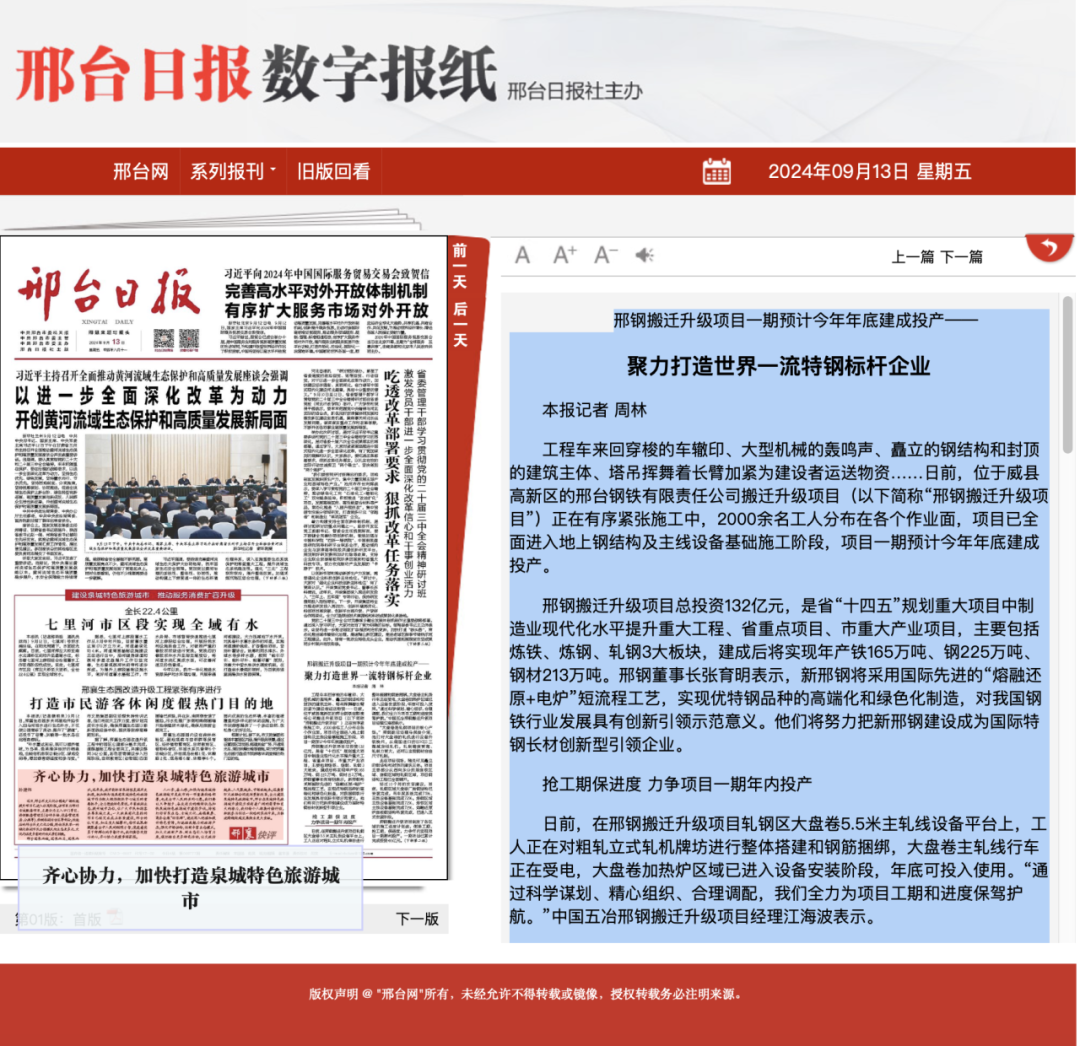 邢鋼搬遷升級項目制定了各區(qū)域的施工進(jìn)度計劃表,倒排工期,搶工期,保進(jìn)度,力爭年內(nèi)實現(xiàn)項目一期順利投產(chǎn)。一期項目已累計完成投資46億元。目前,威縣還在同步推進(jìn)邢鋼搬遷鐵路專用線路項目,已獲得省發(fā)改委立項批復(fù)并列入國家重大項目庫。