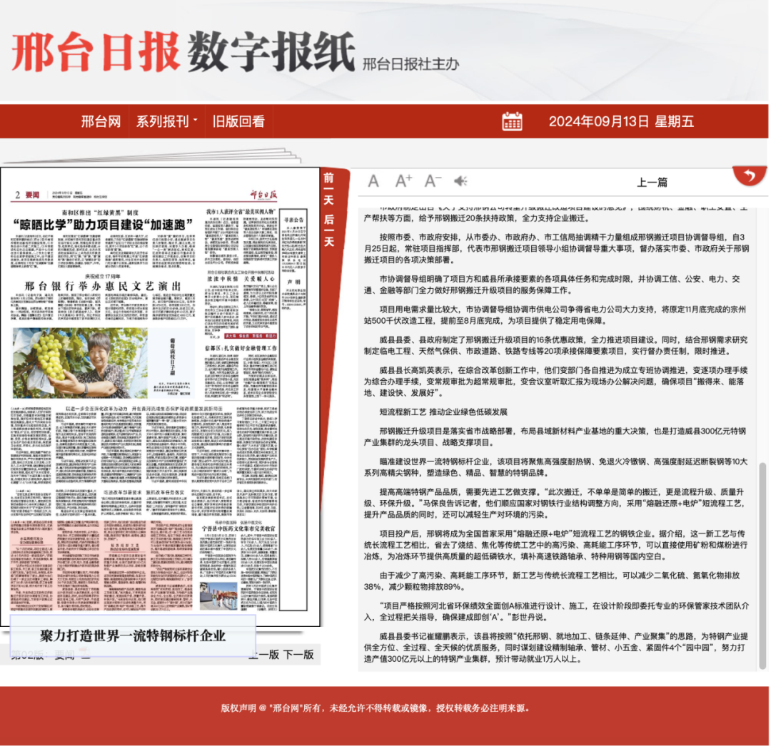 邢鋼搬遷升級項目是落實省市戰(zhàn)略部署,布局縣域新材料產(chǎn)業(yè)基地的重大決策,也是打造威縣300億元特鋼產(chǎn)業(yè)集群的龍頭項目、戰(zhàn)略支撐項目。 瞄準(zhǔn)建設(shè)世界一流特鋼標(biāo)桿企業(yè),該項目將聚焦高強(qiáng)度耐熱鋼、免退火冷鐓鋼、高強(qiáng)度耐延遲斷裂鋼等10大系列高精尖鋼種,塑造綠色、精品、智慧的特鋼品牌。