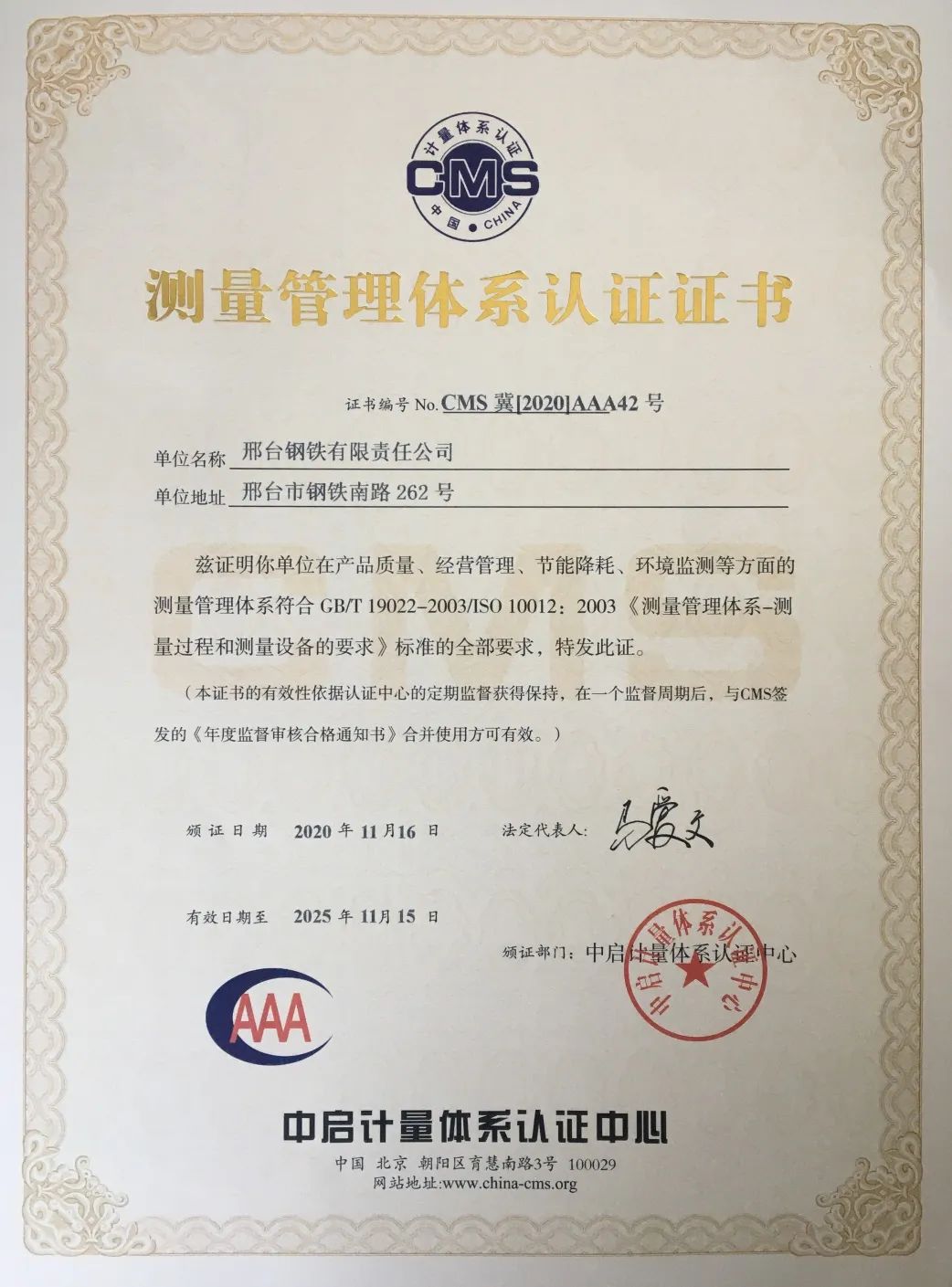 近日,邢鋼正式獲得由中啟認(rèn)證中心頒發(fā)的AAA級(jí)«測(cè)量管理體系年度監(jiān)督審核合格通知書(shū)»,該證書(shū)是測(cè)量管理體系認(rèn)證的最高等級(jí)證書(shū),證書(shū)的持續(xù)取得,標(biāo)志著我公司測(cè)量管理水平已達(dá)到國(guó)家和國(guó)際標(biāo)準(zhǔn)要求。